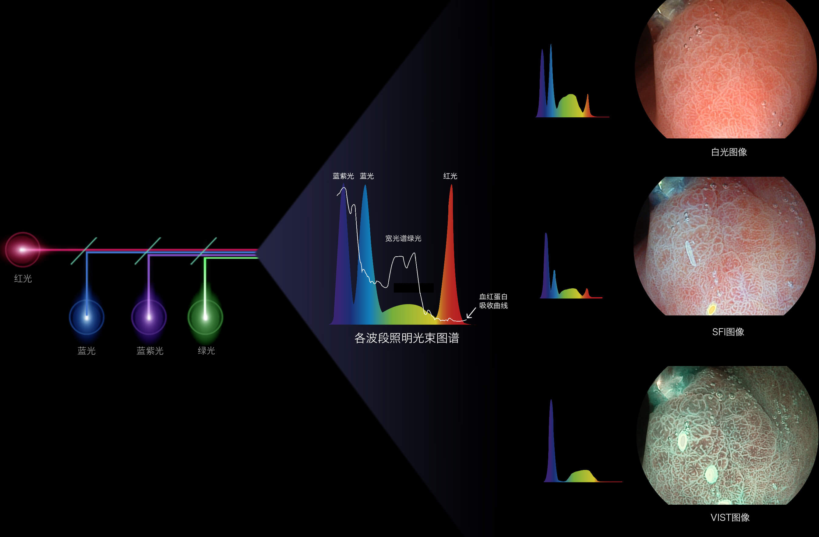 開立新開發(fā)的內(nèi)鏡染色技術(shù),主要是基于多波長(zhǎng)LED 光源的開發(fā),VLS-55Q 四波長(zhǎng)LED 光源是由四個(gè)不同顏色的LED光按照相應(yīng)照明模式所規(guī)定的特定發(fā)光比例進(jìn)行合束后形成,合束后形成的照明光的光譜由紅光、綠光、藍(lán)光及藍(lán)紫光這四個(gè)不同的波段范圍構(gòu)成。具有更高光譜自由度,通過光譜比例的控制,實(shí)現(xiàn)了聚譜成像技術(shù),英文全稱為“Spectral Focused Imaging, SFI”,縮寫為“SFI”和光電復(fù)合染色成像技術(shù),英文全稱為“Versatile Intelligent Staining Technology, VIST”,縮寫為“VIST”。