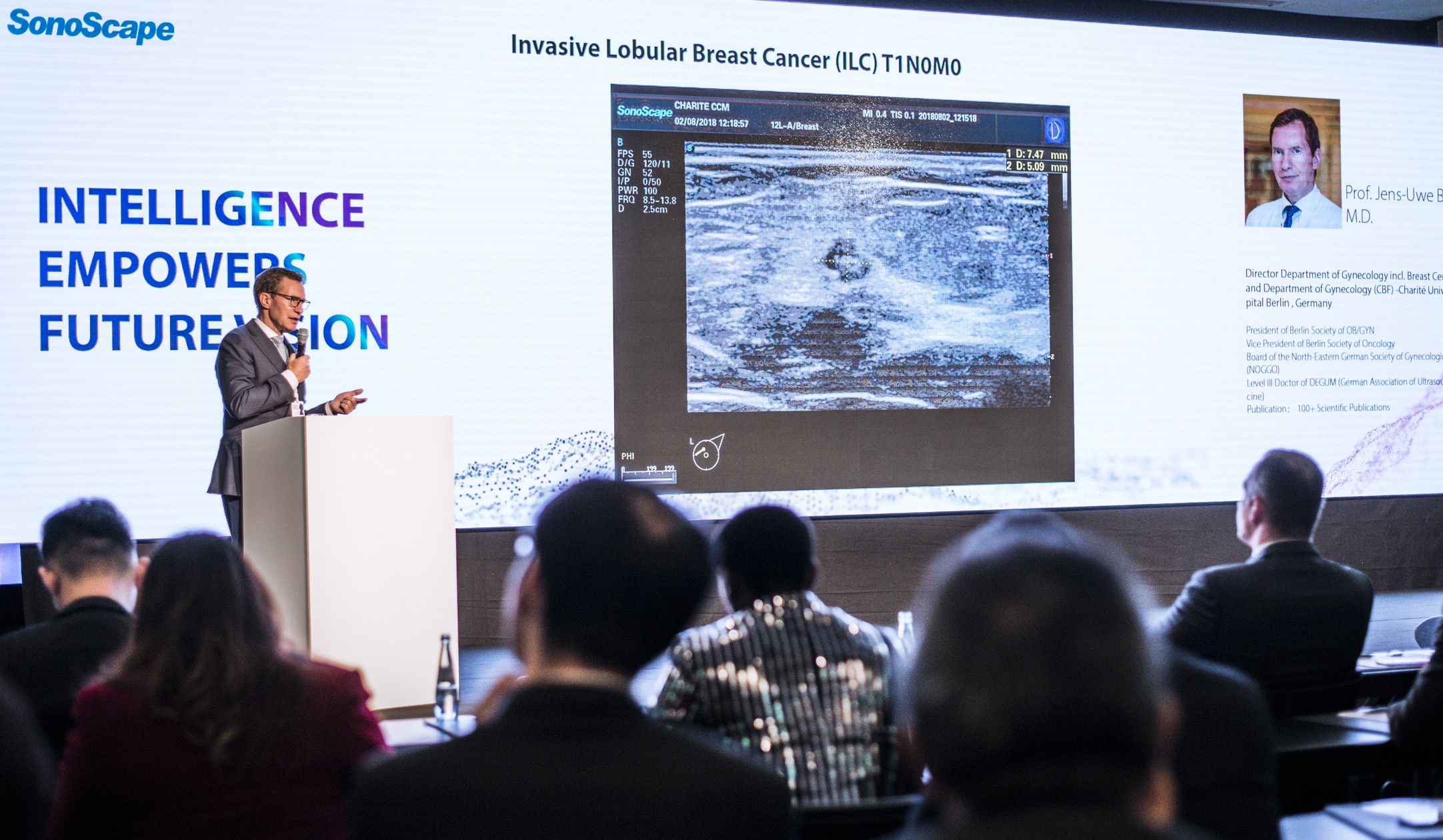 作為Kliniken Essen-Mitte乳腺癌研究項(xiàng)目的負(fù)責(zé)人,另一位乳腺專(zhuān)家Sherko教授則重點(diǎn)分析了超聲對(duì)于乳腺癌篩查重大意義:超聲憑借其快捷、無(wú)創(chuàng)、簡(jiǎn)便等特點(diǎn),已經(jīng)成為目前乳腺癌篩查主要手段,其檢查結(jié)果很大程度上將會(huì)影響后續(xù)的診療措施的制定。但超聲影像下乳腺可疑病灶形態(tài)多樣,對(duì)于臨床鑒別存在一定的難度,而開(kāi)立醫(yī)療自主研發(fā)的S-Breast技術(shù)可以自動(dòng)顯示乳腺可以病變邊界及特征,初步識(shí)別病變的良惡性,輔助醫(yī)生進(jìn)行診斷,給臨床工作帶來(lái)了很大便捷。