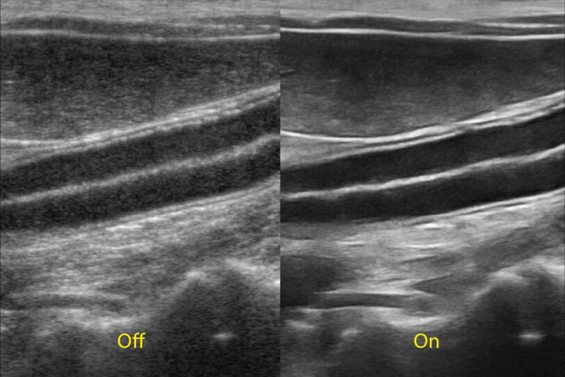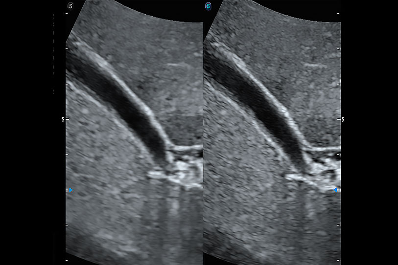 ProPet 70 進(jìn)一步提升了微米成像算法,更加注重對(duì)基礎(chǔ)原始圖像的還原和保留,在有效減少斑點(diǎn)噪聲、增強(qiáng)組織邊界顯示的同時(shí),避免過(guò)度優(yōu)化丟失真實(shí)的解剖信息。